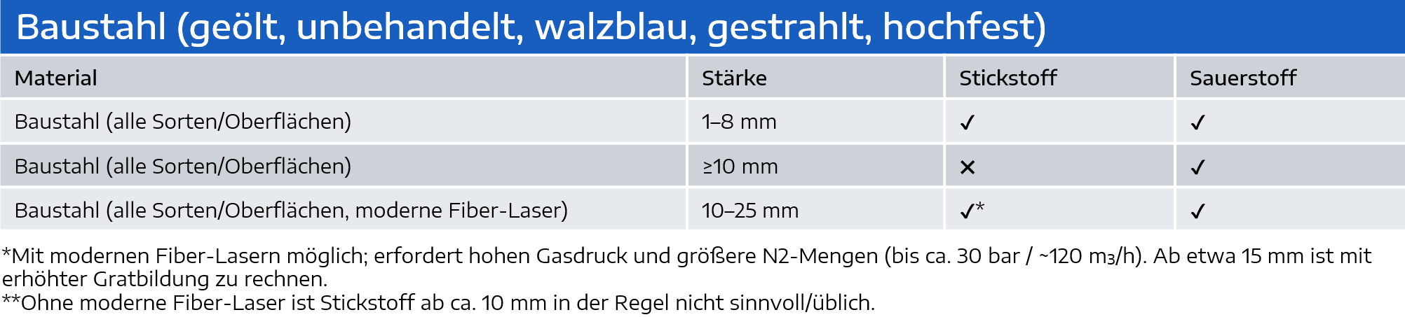 - Baustahl bis etwa 8 mm; bei den neuen Fiber-Lasern bis zu 25 mm.