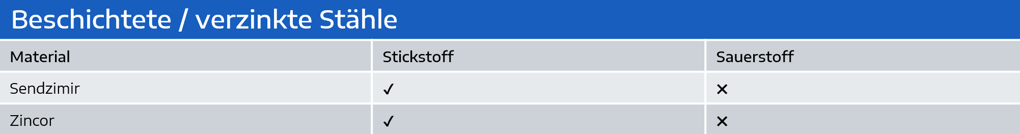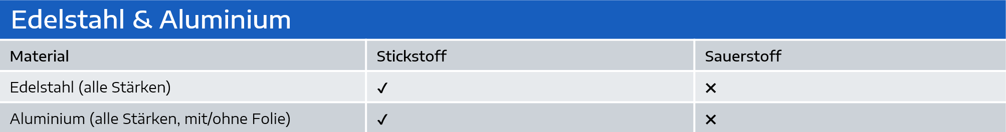 Die nachfolgende Tabelle zeigt, bei welchen Materialien Stickstoff oder Sauerstoff verwendet wird: